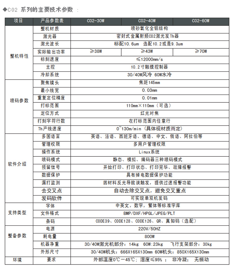 CO2 30/40/60W 系列規格書/激光噴碼機 提供高品質、可靠的激光系統,深受多個國家/地區客戶信賴。