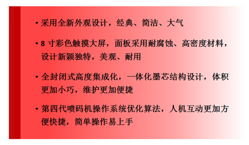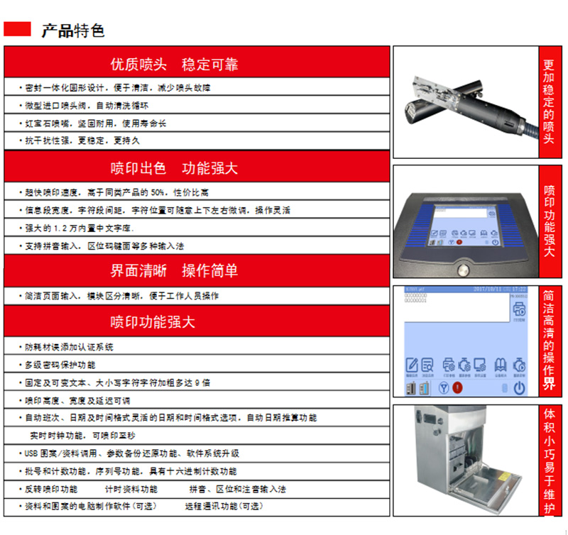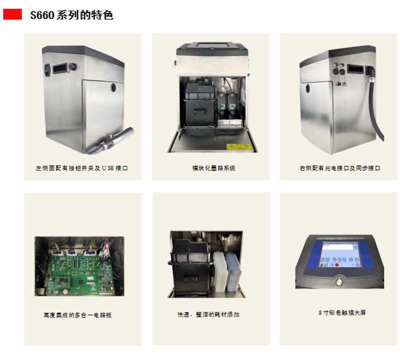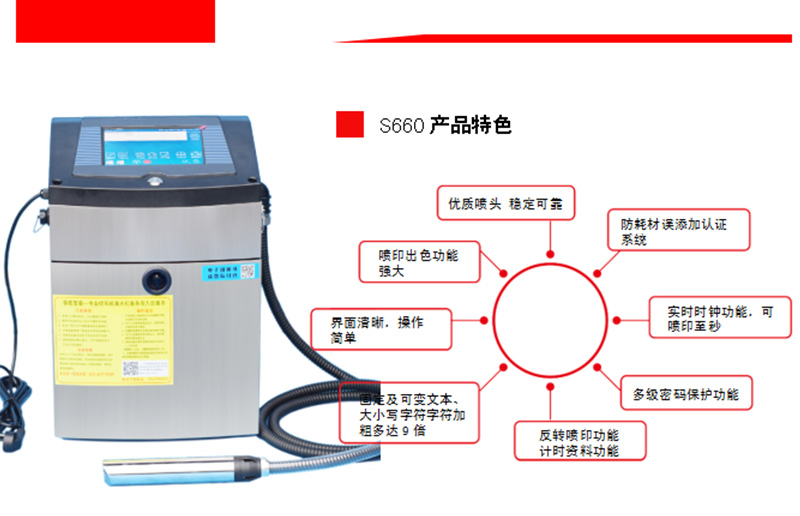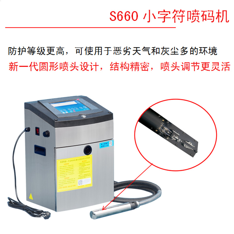 S660小字符噴碼機(jī)防護(hù)等級(jí)更高,可使用于惡劣天氣和灰塵多的環(huán)境新一代圓形噴頭設(shè)計(jì),結(jié)構(gòu)精密,噴頭調(diào)節(jié)更靈活